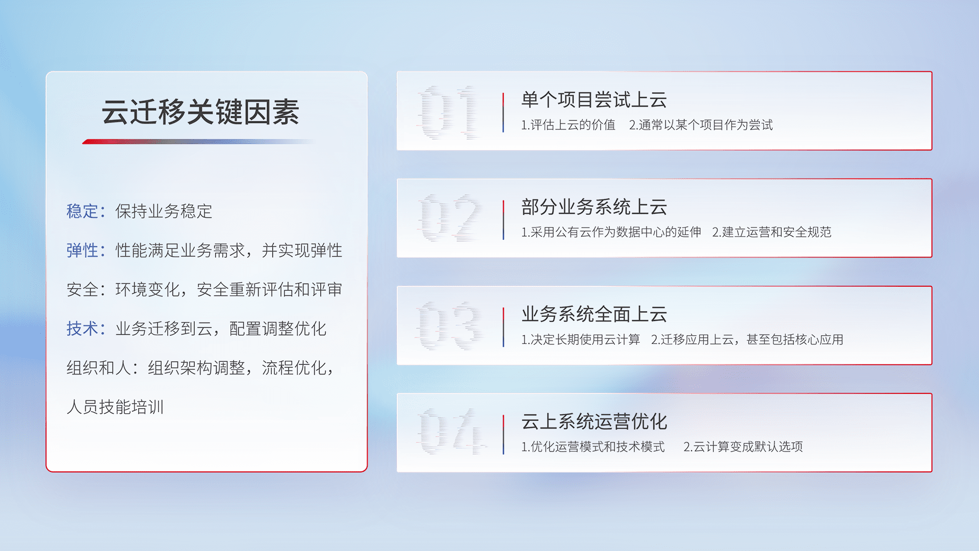 结合实际业务,,,从规划设计、、、云平台选型、、、、云原生改造、、数据迁移、、集成交付,,迁移全过程为客户识别最佳上云路径,,,做好风险识别管理,,,,设计网络架构、、、、身份权限、、、安全审计合规、、操作审计、、、、日志审计、、、监控告警策略、、、、多站点容灾设计等,,,对云上基础设施进行整体规划,,提升IT治理水平,,,,以满足弹性、、高可用、、、高性能的需求。。。