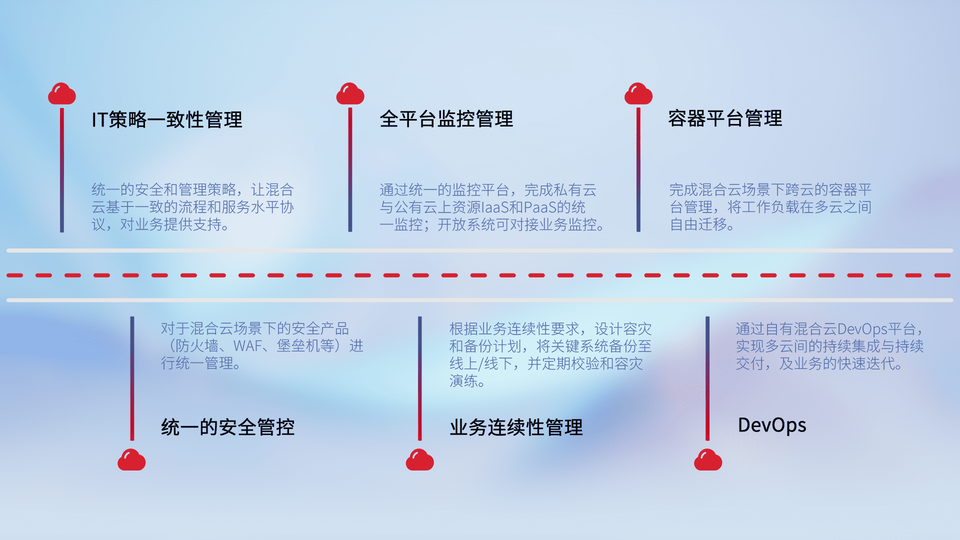通过多云纳管,,,,以统一的资源数据模型把客户的云资源进行抽象和封装,,,进而实现对多云资源的统一操作,,,,保障云资源管理的可靠性、、、稳定性与可用性。。量身定制化运维内容,,配置、、、、开发运维、、、、补丁管理、、备份、、、、监控、、、认证和访问管理、、审计和日常巡检等,,,,保障在用云过程中的可靠度,,稳定度以及高可用率。。。
