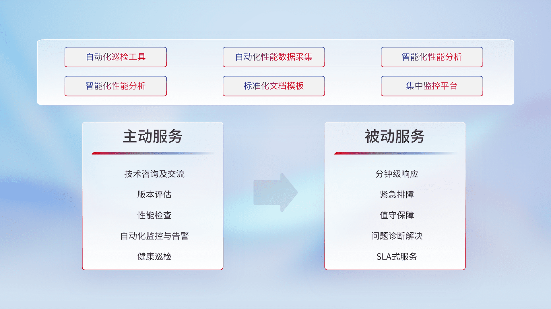智能化工具和标准化文档,,,保障服务质量,,提供主动服务(包含技术咨询、、、版本评估、、性能检查、、、自动化监控与告警、、、、健康巡检)和被动服务包含(分钟级响应、、、、紧急排障、、、、值守保障、、、问题诊断解决、、、SLA服务)。。